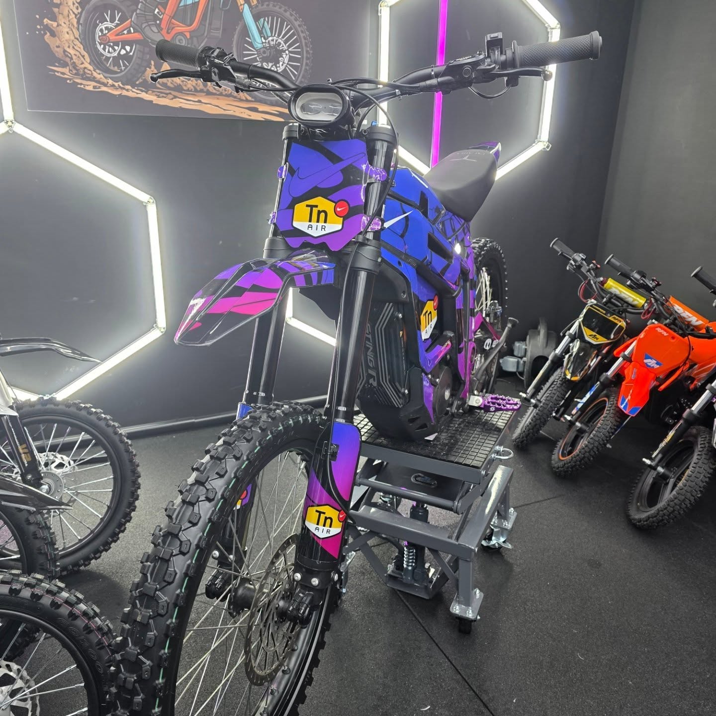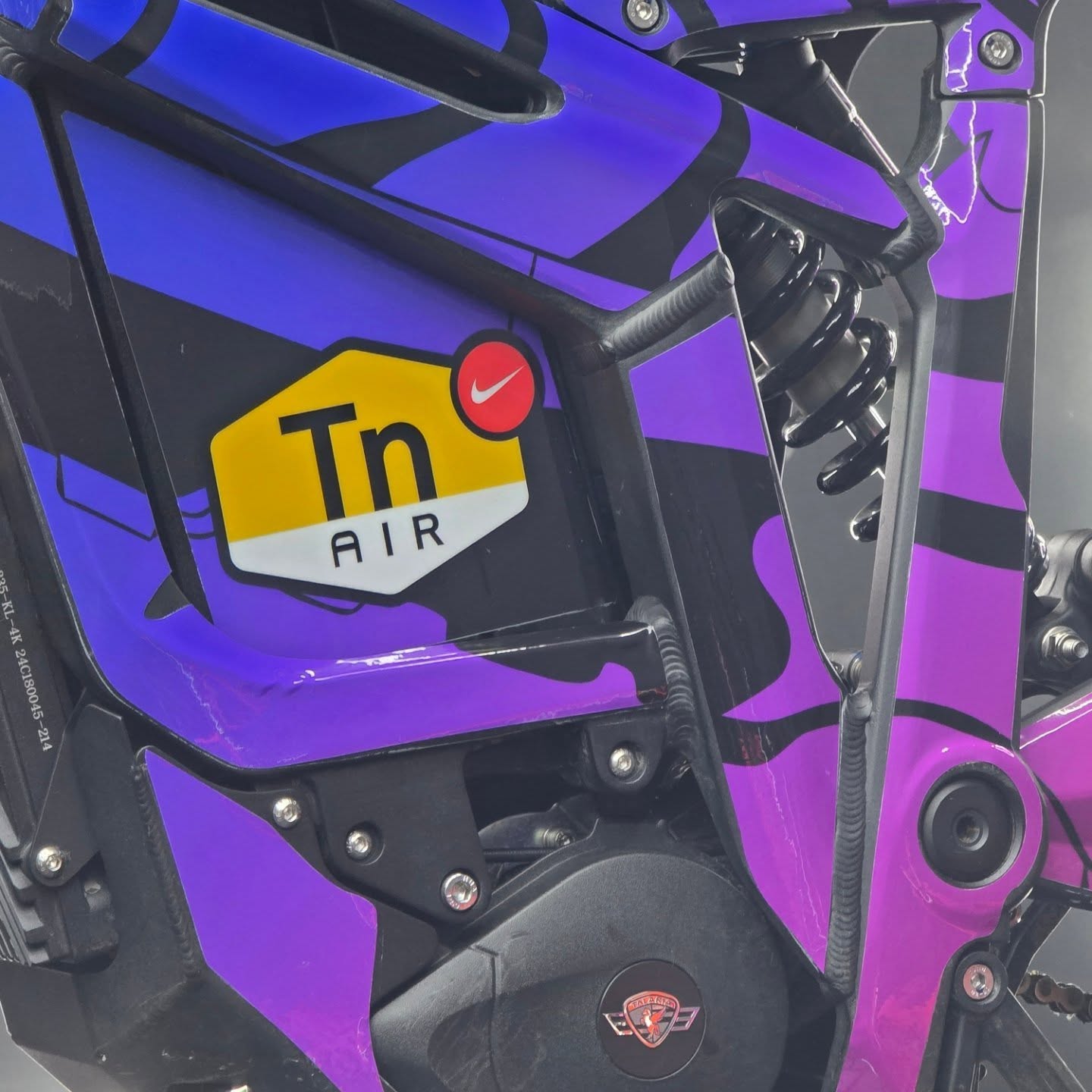Frame construction High strength steel, removable motor plate, integrated chain tensioner, loop tail design, quick release battery system, 2-point foot peg position mounts, frame mounted stunt peg compatible.